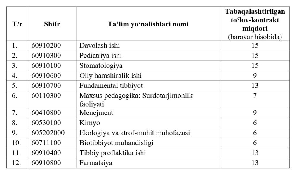 Toshkent davlat tibbiyot universitetining quyidagi bakalavr ta’lim yo’nalishlari bo’yicha 2025/2026-oʻquv yili uchun tabaqalashtirilgan toʻlovkontrakt miqdori: