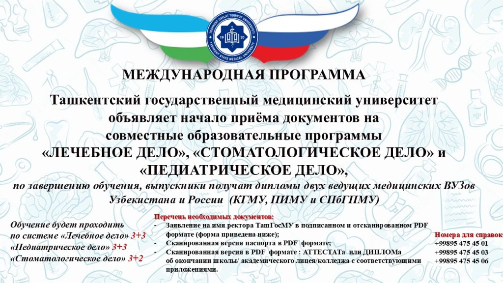 Ташкентский государственный медицинский университет совместно с ведущими государственными медицинскими университетами Российской Федерации объявляет о начале приёма документов на обучение по совместным образовательным программам.